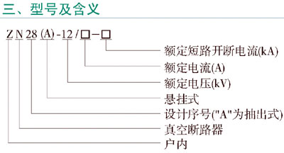 ZN28-12系列真空断路器为额定电压12kV,三相交流50Hz的户内高压开关设备。该产品总体结构分为开关本体与操动机构一体安装和开关本体与操动机构分离安装两种形式。一体式结构即为ZN28-12基本型;分体式结构为ZN28A-12型,适用于各种固定式开关柜,如CClA(Z),XGN2A-10(Z)等。