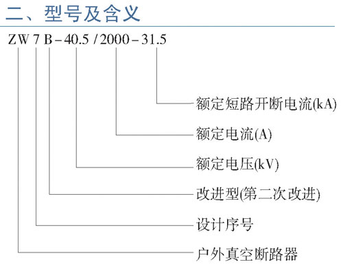 一、概述 ZW7B-40.5系列户外高压真空断路器(以下简称“断路器”)用于交流50Hz、40.5kV的三相电力系统中,作为分、合负荷电流、过载电流及短路电流之用。 该产品使用时应该满足以下环境条件: a周围空气温度:上限+40度,下限-40度; b.海拔:≤1000m(超过1000m时,按相应海拔系数修正电气参数; c.风压:不超过700Pa(相当于风速34m/s); d.地震烈度:不超过8度; e.污秽等级:III级(防污型达Ⅳ级)。